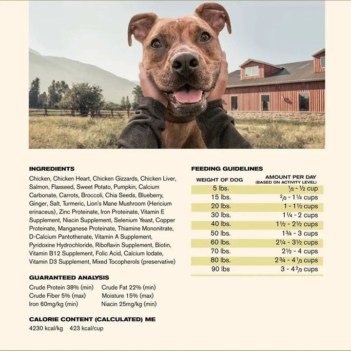 Chicken, Chicken Heart, Chicken Gizzards, Chicken Liver, Salmon, Flaxseed, Sweet Potato, Pumpkin, Calcium Carbonate, Carrots, Broccoli, Chia Seeds, Blueberry, Ginger, Salt, Turmeric, Lion's Mane Mushroom (Hericium erinaceus), Zinc Proteinate, Irom Proteinate, Vitamin E Supplement, Niacin Supplement, Selenium Yeast, Copper Priteinate, Manganese Proteinate, Thiamine Mononitrate, d-Calcium Pantothenate, Vitamin A Supplement, Pryridoxine Hydrochloride, Riboflavin Supplement, Biotin, Vitamin B12 Supplement, Folic Acid, Calcium Iodate, Vitamin D3 Supplements, Mixed Tocopherols (preservative).