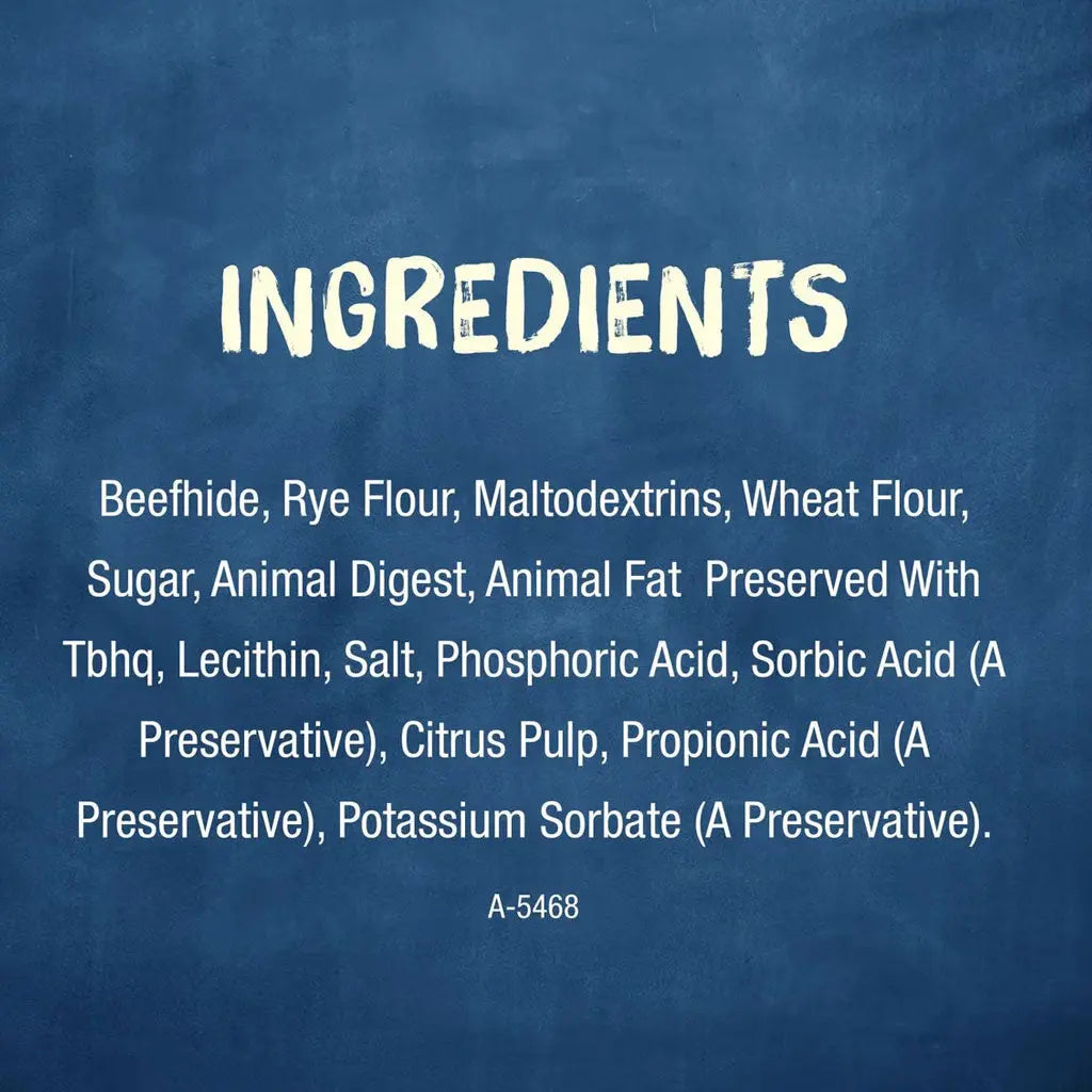 Beefhide, Rye Flour, Maltodextrins, Wheat Flour, Sugar, Animal Digest, Animal Fat Preserved With Tbhq, Lecithin, Salt, Phosphoric Acid, Sorbic Acid (A Preservative), Citrus Pulp, Propionic Acid (A Preservative), Potassium Sorbate (A Preservative). A-5468.