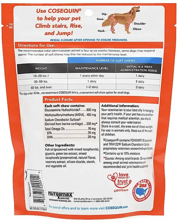 Cosequin Maximum Strength Plus MSM & Omega-3's contain glucosamine hydrochloride, sodium chondroitin sulfate, and methylsulfonylmethane (MSM). This combination of ingredients help support healthy cartilage. Each soft chew also contains omega-3 fatty acids to help support skin & coat health. Cosequin joint health supplements are brought to you by Nutramax Laboratories Veterinary Sciences, the #1 veterinarian recommended supplement company. Source: Among retail brands. Survey conducted among small animal veterinarians who recommended oral joint health supplements. *Source: Survey conducted among small animal veterinarians who recommended animal supplements.