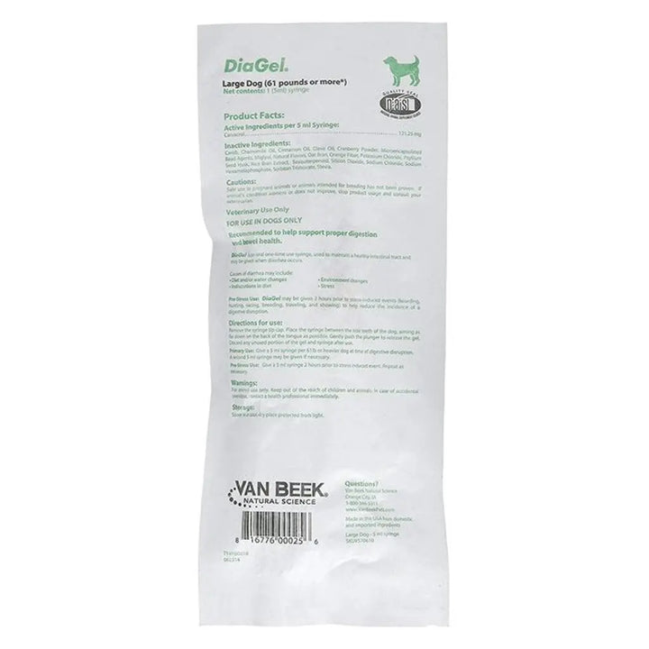 DiaGel is an orally given gel that can be used in the event of a digestive upsets to quickly support proper bowel health in dogs. The focused delivery of Van Beek Natural Science's proprietary compound quickly supports normal GI function. In most cases results can be seen in as little as 24 hours, with just one syringe. DiaGel is made from natural ingredients, has no known side effects, and each formula is safe for dogs.