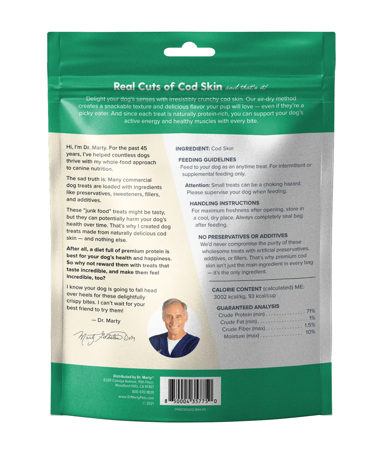Dr Marty Treats offer the perfect balance between taste and nutrition for your beloved pet. With the wild-caught, delicious flavor of cod and the health benefits of freeze-dried raw food, your dog is sure to want more. Reward your pet with the natural goodness of Dr. Marty Cod Crispies.