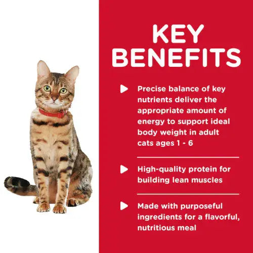 - Precise balance of key nutrients deliver the appropriate amount of energy to support ideal body weight in adult cats ages 1 - 6