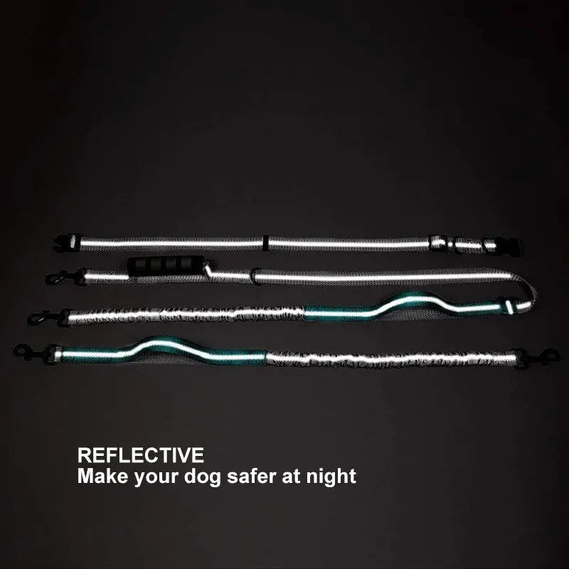 Retractable bungee double dog leash - This dog leash consists of the main rope and another bungee leash that can be separated from the main rope. Connected to the main rope by hooks. Allows you to pull a dog or two dogs according to your needs. The main rope elastic size range is 165cm / 5.4ft (no stretch) - 185cm / 6ft (stretch). 2.5cm/1in wide. Suitable for medium and large dogs under 50kg / 110lbs. Bungee can reduce the pressure generated by pulling and absorb sudden changes in the direction of the dog.