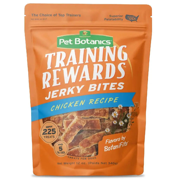 Pet Botanics® Training Rewards™ Jerky Bites are the perfect low-calorie training treats. With natural chicken and added BotaniFits™, a proprietary botanical blend of ingredients like rosemary and chamomile, Pet Botanics has the aroma and palatability your dog will crave.