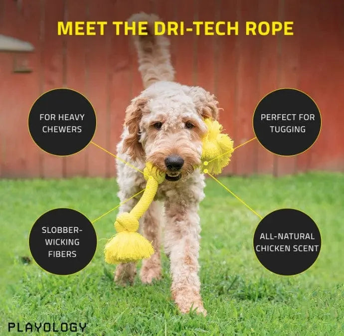 Meet the Dri-Tech Rope by Playology, the perfect toy for Heavy chewers of all ages. Built with durable fiber and Encapsiscent Technology, this toy resists tearing, wicks away slobber, and won’t lose its irresistible all-natural chicken scent, no matter how excited your pup gets. It’s also perfect for creating vigorous exercise-based play like tugging. Our Encapsiscent Technology means you won’t wash away the all-natural scent they love. Dishwasher safe to clean and sanitize. To ensure life of scent, do not use detergent and place on top rack.