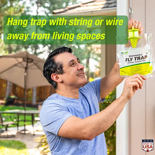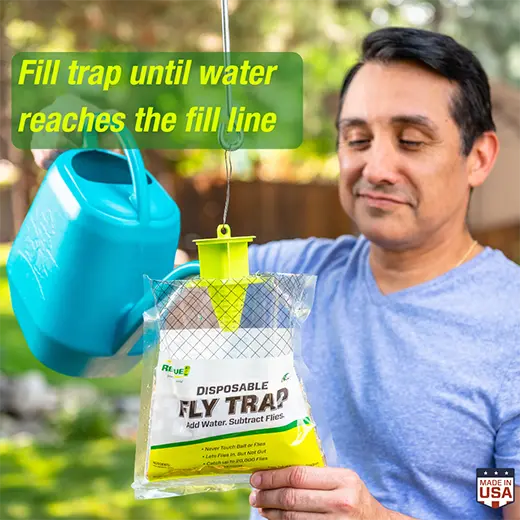 Flies find it fast! The lure pouch inside the bag dissolves and activates when you add water. Lured by the scent, flies enter the trap through the green top cap and drown in the water.