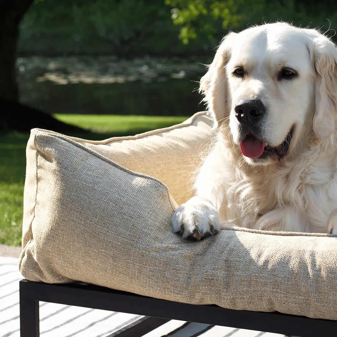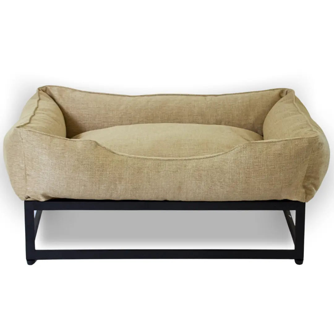 The bolster dog bed top and metal platform base attach together with a hidden zipper and can also be used separately. The metal base is suitable for indoor and outdoor use.