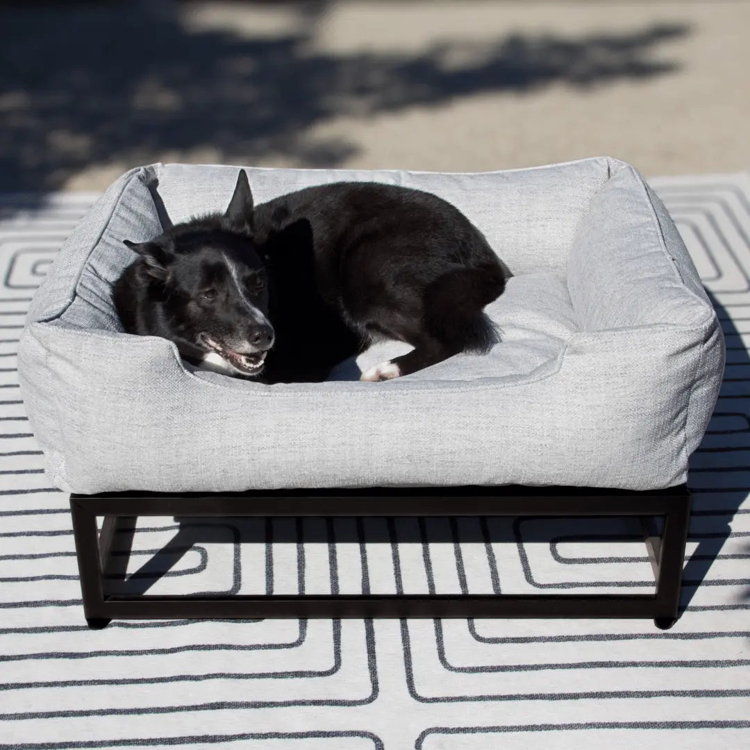 The bolster dog bed top and metal platform base attach together with a hidden zipper and can also be used separately. The metal base is suitable for indoor and outdoor use.