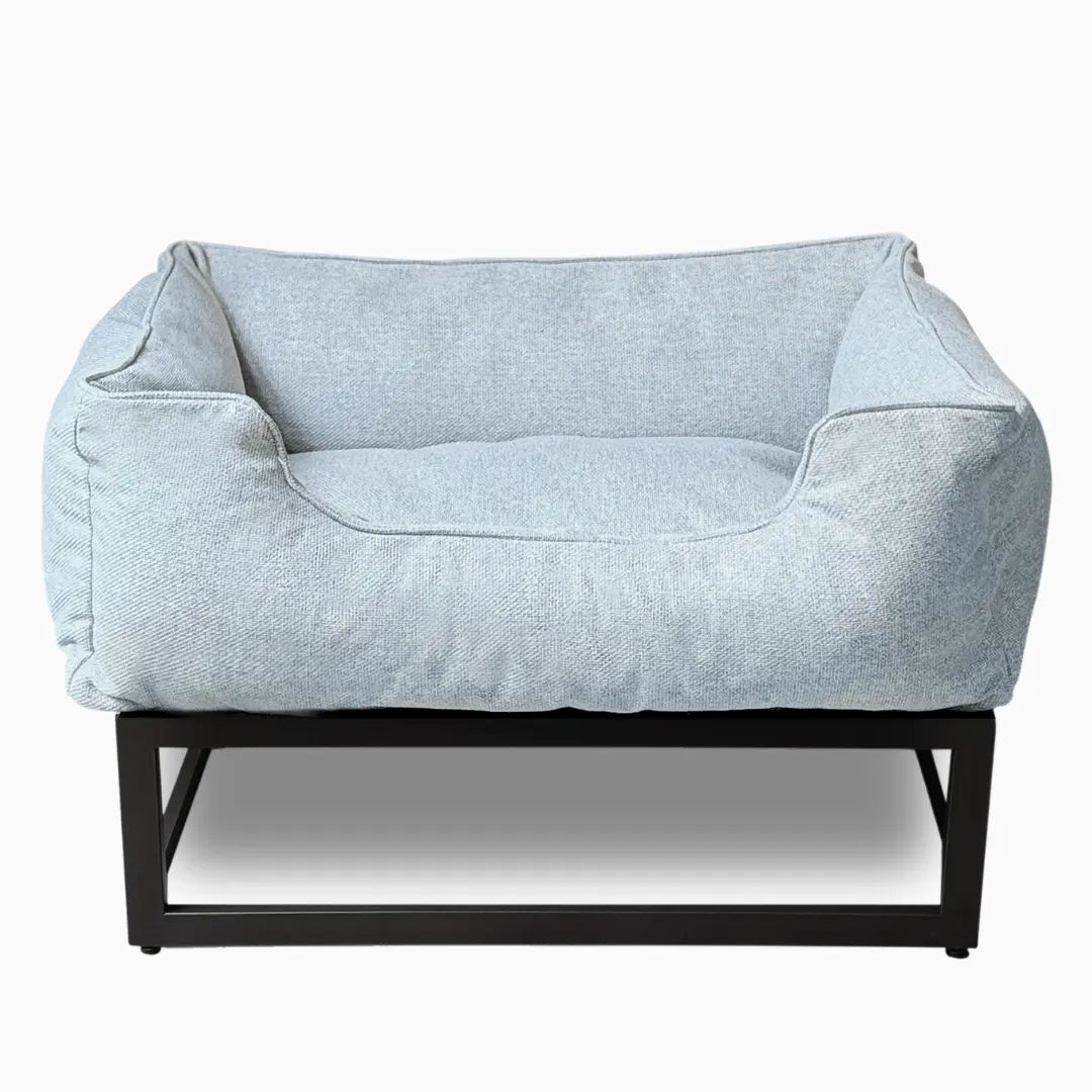 The bolster dog bed top and metal platform base attach together with a hidden zipper and can also be used separately. The metal base is suitable for indoor and outdoor use.